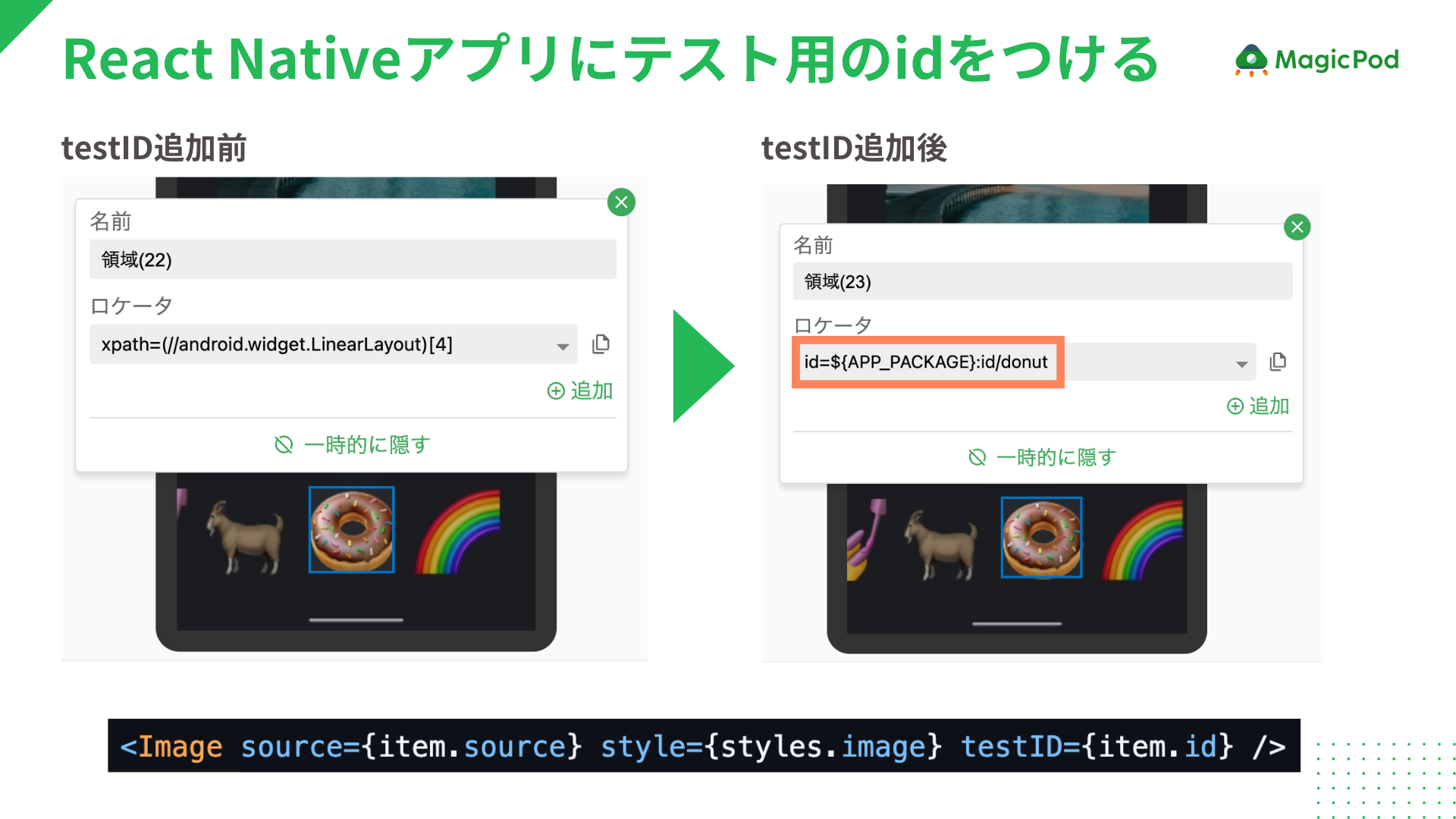 React NativeではtestIDをソースコードに追加することで、テスト用のidを付与することができます。testIDを追加後、「donut」というidで要素が選択できるようになりました。