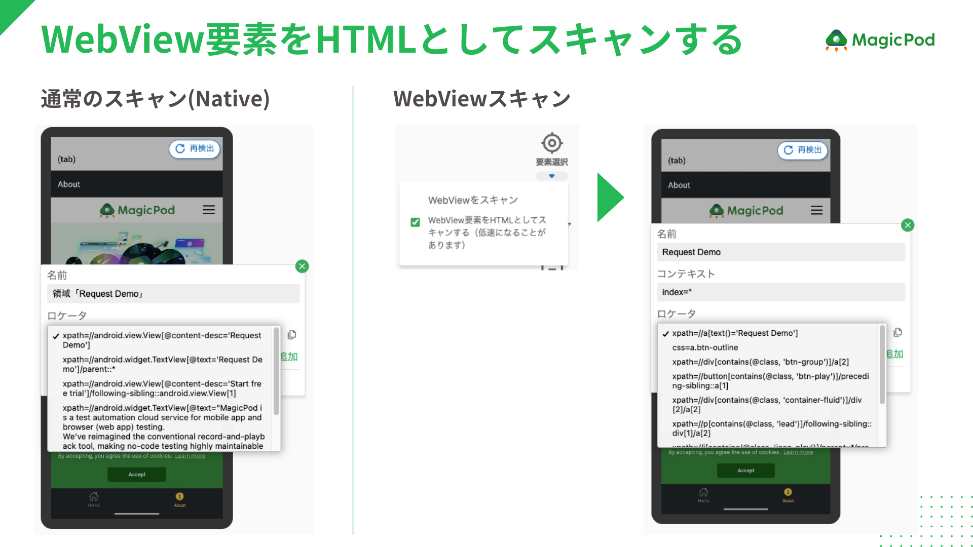 例えば、この画面はWebViewを使用してMagicPodのサービスサイトを表示させていますが、WebViewスキャンを行なっている右側のケースでは「//a[text()=’Request Demo’]」などのHTML要素がロケーターの候補として表示されています。