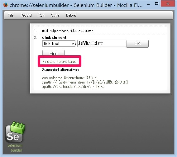 Builderで、スクリプト編集中に「Find a different target」というボタンを押し、要素をブラウザ上でクリックすると、スクリプトの操作対象がクリックした要素に書き換わります。(図10)