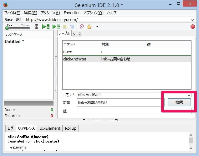 IDEでコマンドの編集中に、「検索」ボタンを押すと、ブラウザ上の該当する要素をハイライトすることができます。(図9)